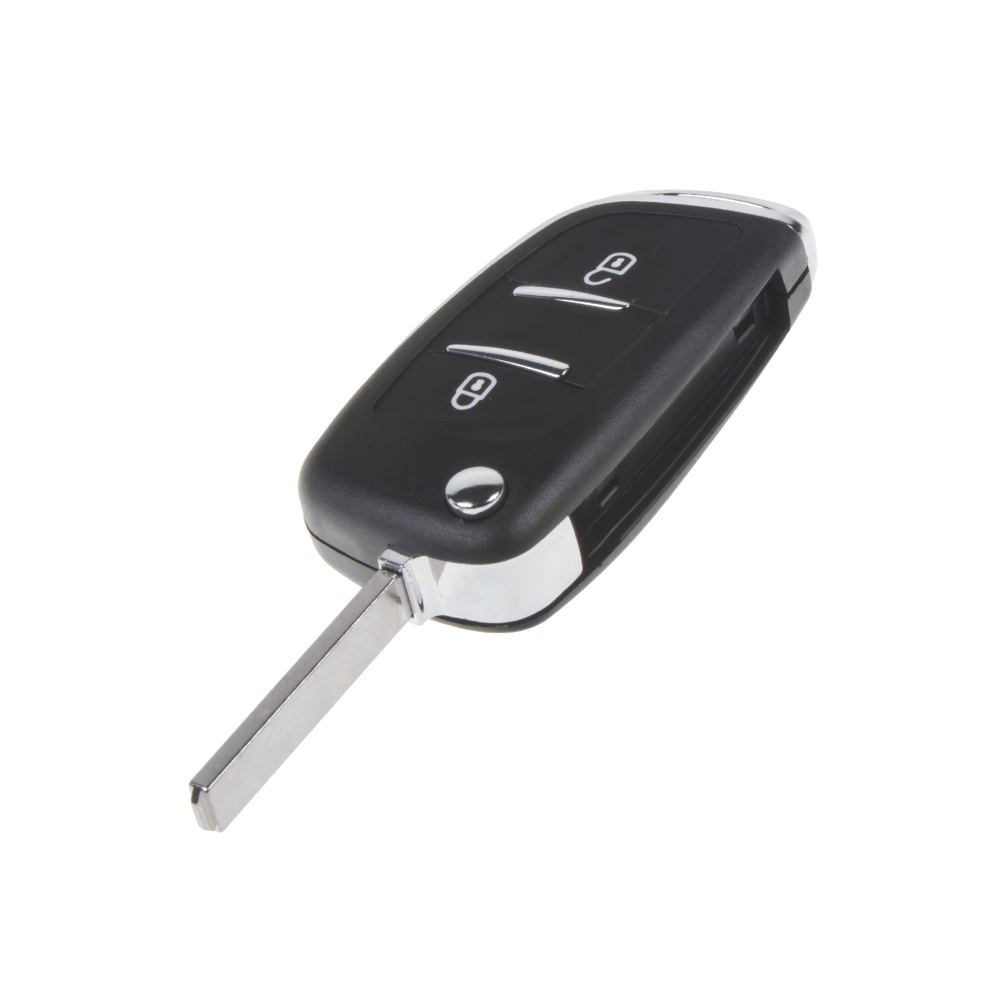 Náhradní obal vystřelovacího klíče pro vozy Citroën/Peugeot s 2-tlačítkovým vystřelovacím klíčem (bez elektroniky a čipu imobilizéru). Slouží pro změnu ze staršího vystřelovacího klíče na novější verzi. Do vystřelovacího klíče je nutno vložit z původního klíče elektroniku dálkového ovládání a čip imobilizéru (transpondér), planžetu klíče je třeba nechat vyfrézovat podle tvaru originálního klíče.