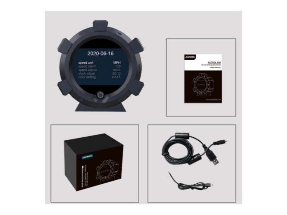 displej zobrazuje: stupeň sjezdu a stoupání vozidel během jízdy, rychlost, hodiny, počet satelitů, směr jízdy, napětí baterie, nadmořskou výšku, ujetou vzdálenost, doba jízdy