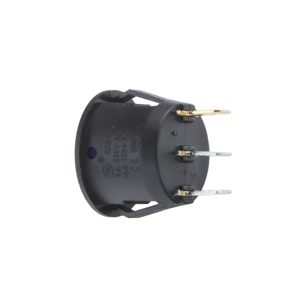 Spínač kolébkový kulatý 20 A modrý s LED podsvícením, průměr otvoru 20 mm, pro napájecí napětí 12 V. Spíná kladné napětí mezi kontakty 1 a 2, na kontaktu 3 je kostra pro podsvícení.