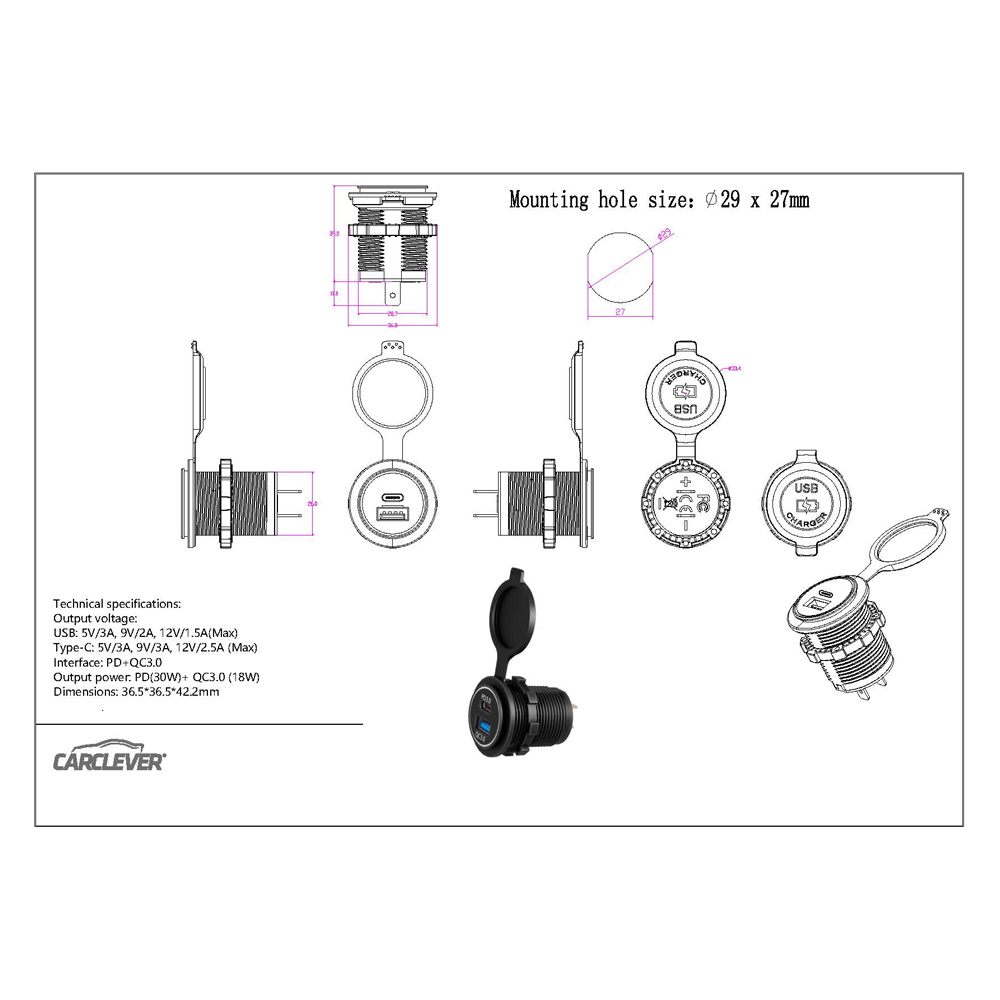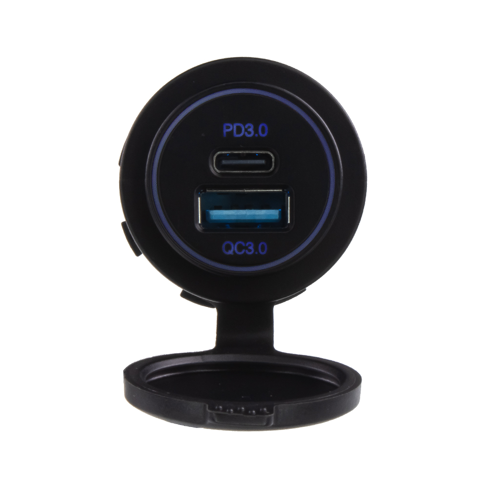 USB nabíječka do panelu, QC3.0 + USB-C, s krytkou proti prachu a vlhkosti.