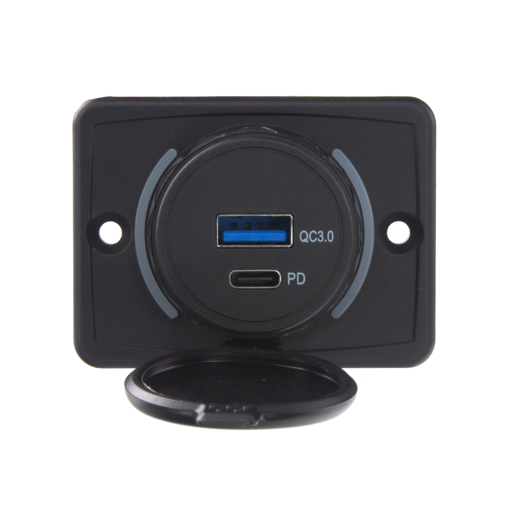 2x USB nabíječka (1x USB, 1x USB-C) pro montáž na povrch, bílé podsvícení.
