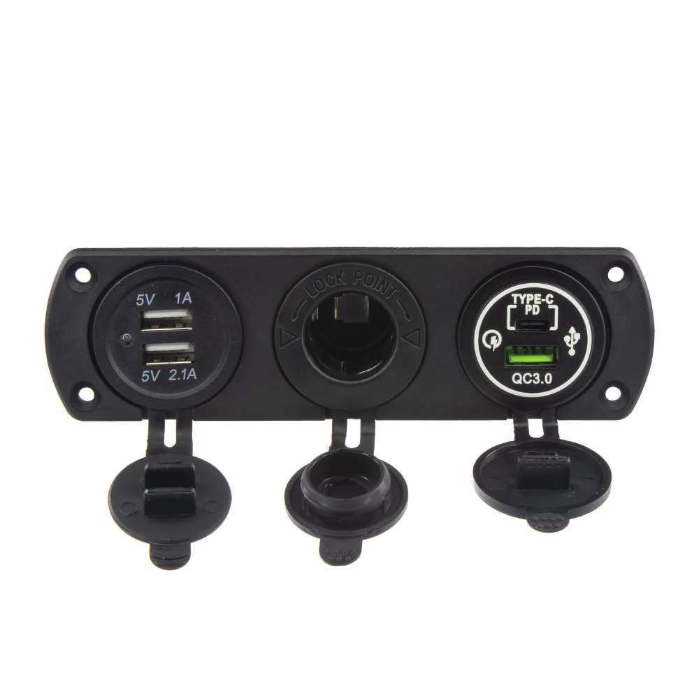 Trojitá zásuvka do panelu CL, 2x USB-A (3,1 A) + 1x USB-A (QC3.0) + 1x USB-C (PD) nabíječka voděodolná.