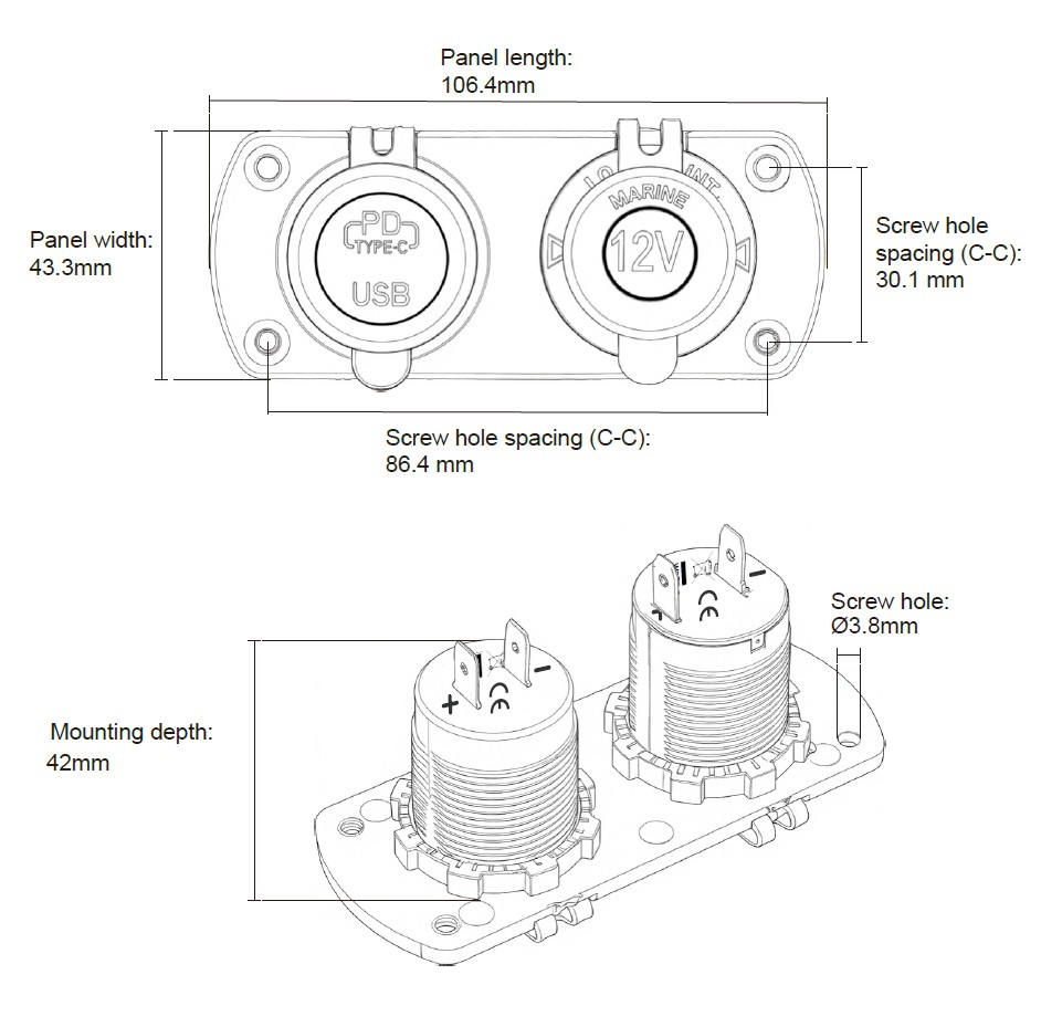 Dvojitá zásuvka do panelu 1x CL (max. 20 A) + 2x nabíječka USB voděodolná.
