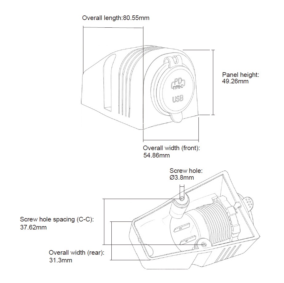 rozměry: š 55 mm x v 50 mm (přední) x hl 80 mm