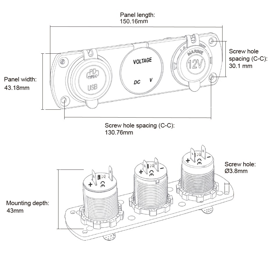Trojitá zásuvka do panelu s voltmetrem, CL, 1x USB-A, 1x USB-C, nabíječka voděodolná.