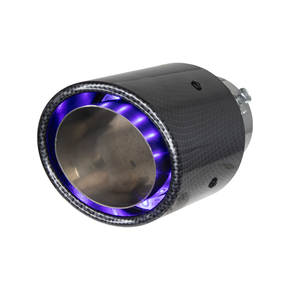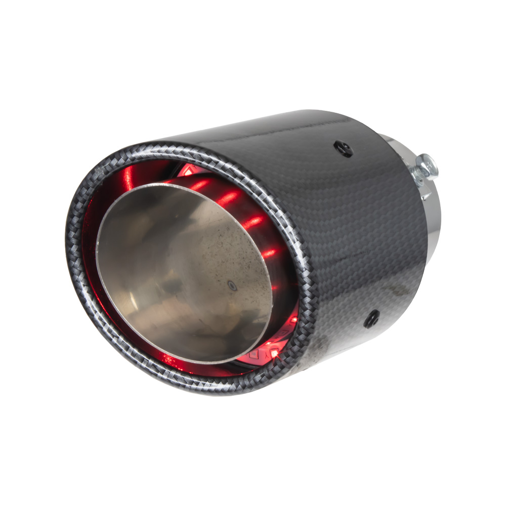 Univerzální tuningová koncovka výfuku s červeným nebo modrým LED podsvícením. Dodejte svému vozu sportovní a futuristický vzhled s tímto luminescenčním krytem výfuku z uhlíkového vlákna.