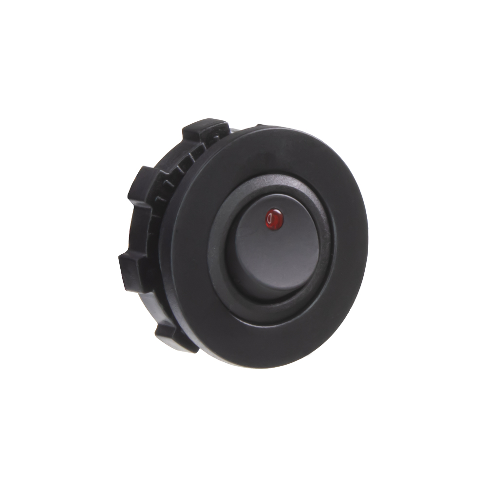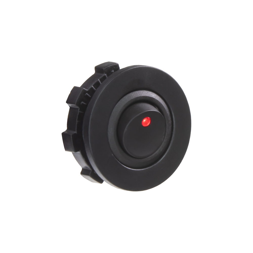 Spínač kolébkový kulatý 20A červená LED. Spíná kladné napětí mezi kontakty 1 a 2, na kontaktu 3 je kostra pro podsvícení.