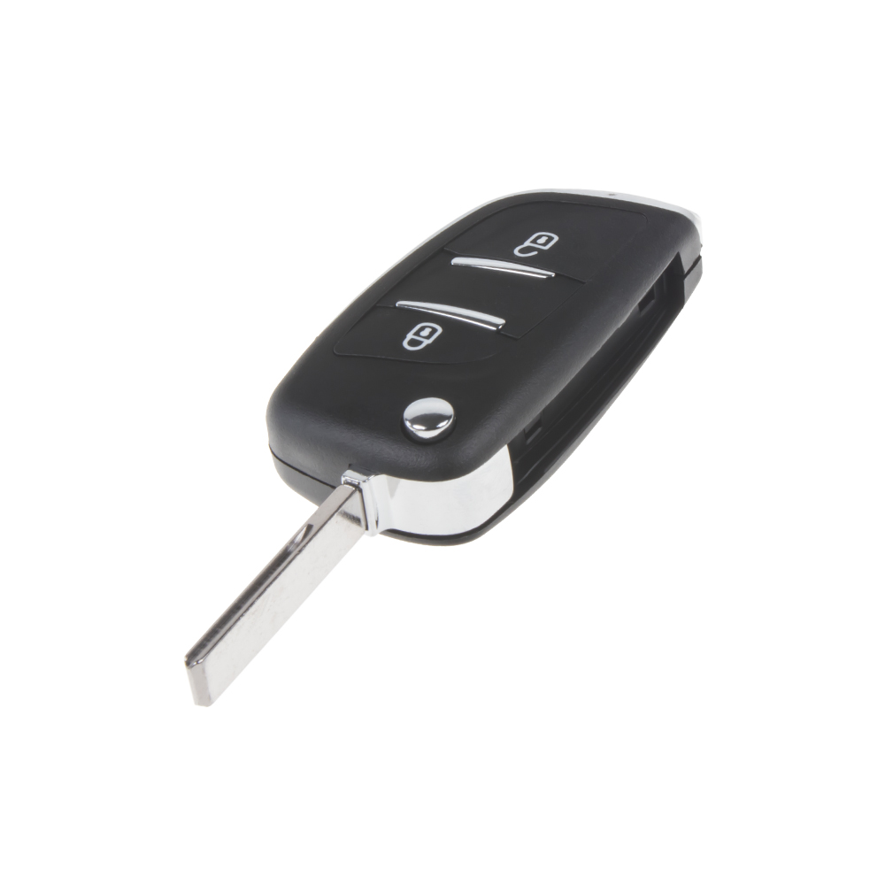 Náhradní obal vystřelovacího klíče pro vozy Citroën/Peugeot s 2-tlačítkovým vystřelovacím klíčem (bez elektroniky a čipu imobilizéru). Slouží pro změnu ze staršího vystřelovacího klíče na novější verzi. Do vystřelovacího klíče je nutno vložit z původního klíče elektroniku dálkového ovládání a čip imobilizéru (transpondér), planžetu klíče je třeba nechat vyfrézovat podle tvaru originálního klíče.
