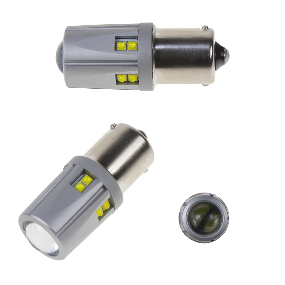 Nová generace LED autožárovek s paticí BA15S, bílá, 12 x super svítivý LED čip 5 W + rozptylová krycí čočka.