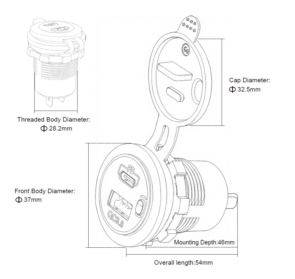 USB nabíječka do panelu, QC3.0 + USB-C, s krytkou proti prachu a vlhkosti.