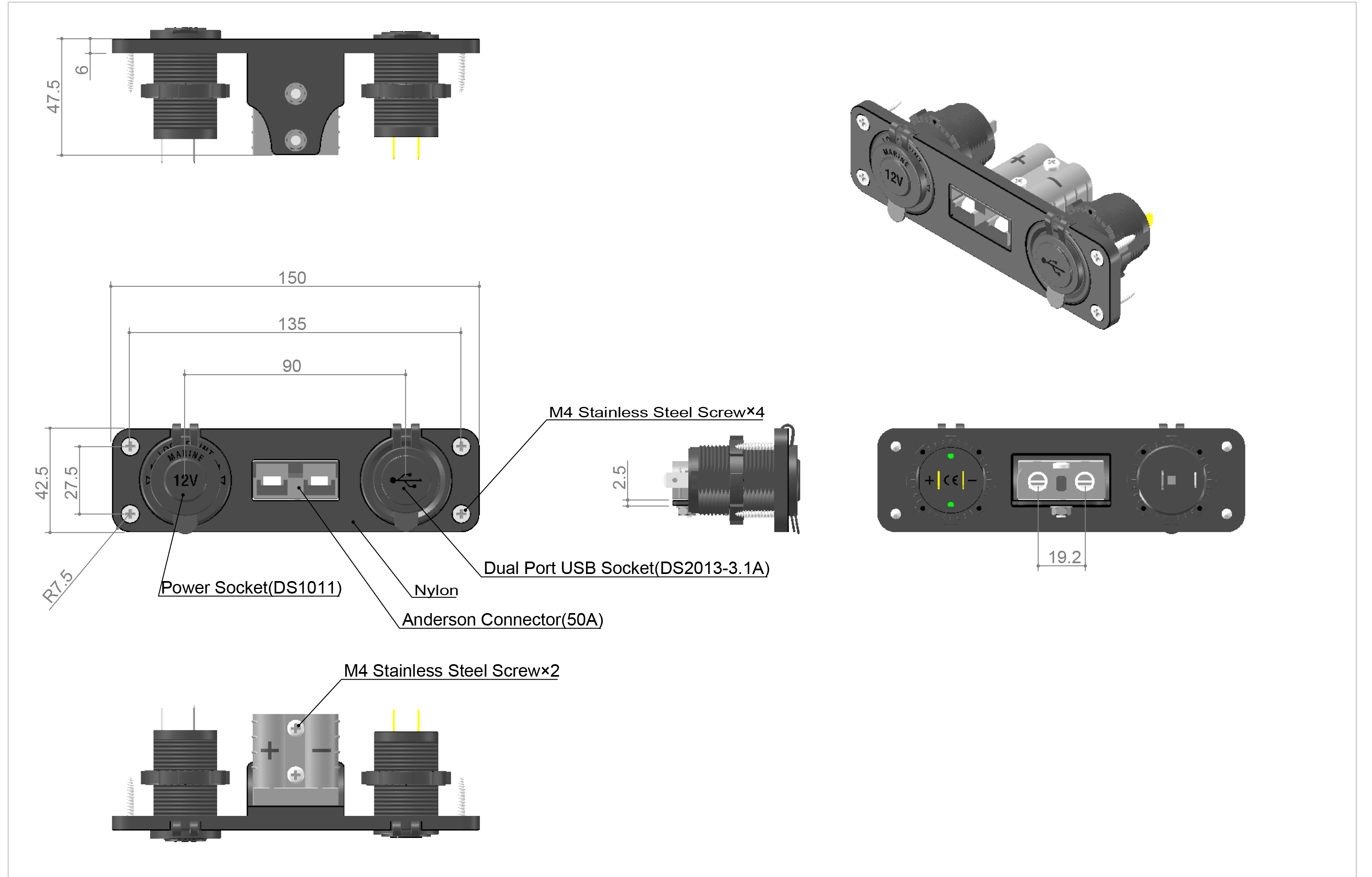 2x USB, CL + Anderson zásuvka pro zabudování do panelu.