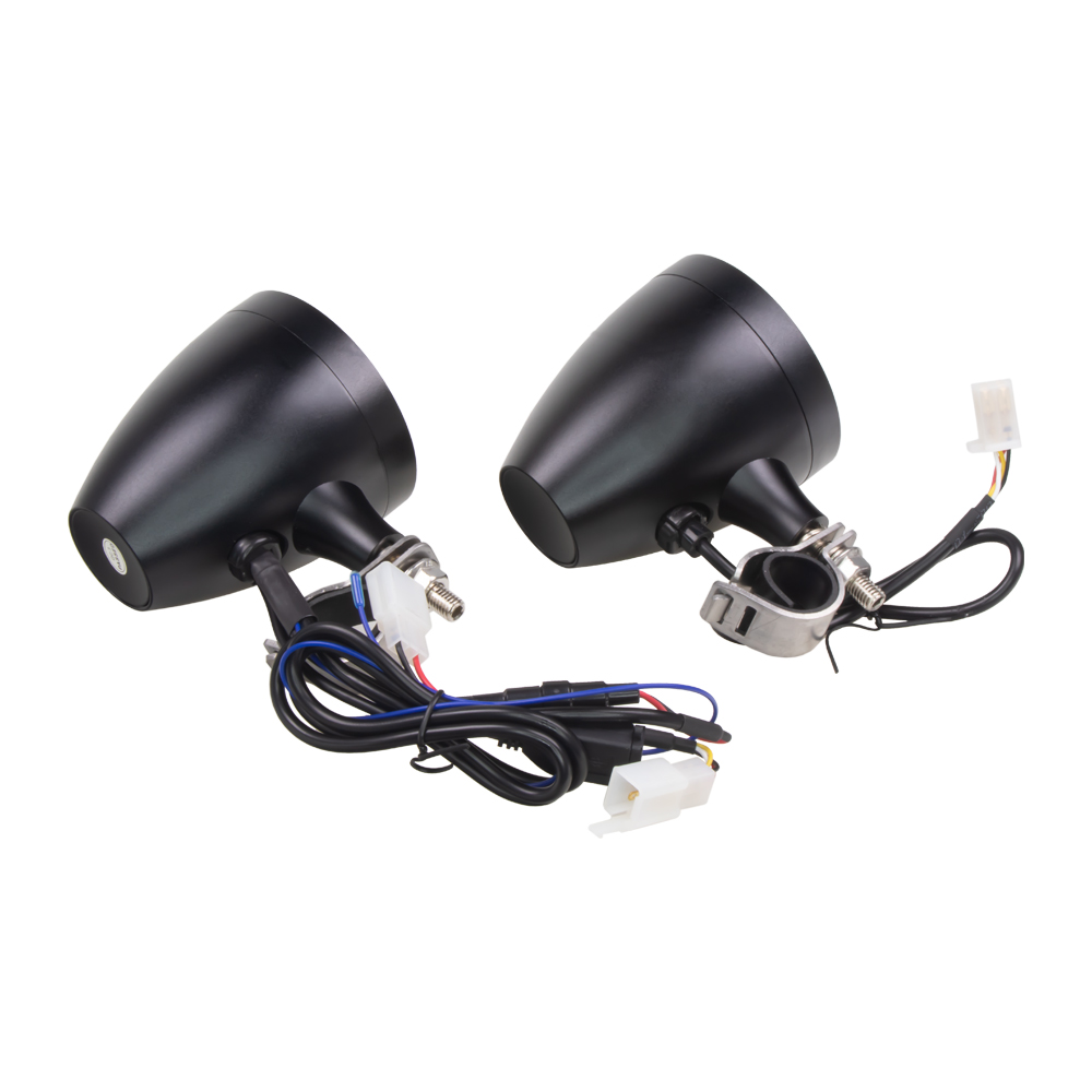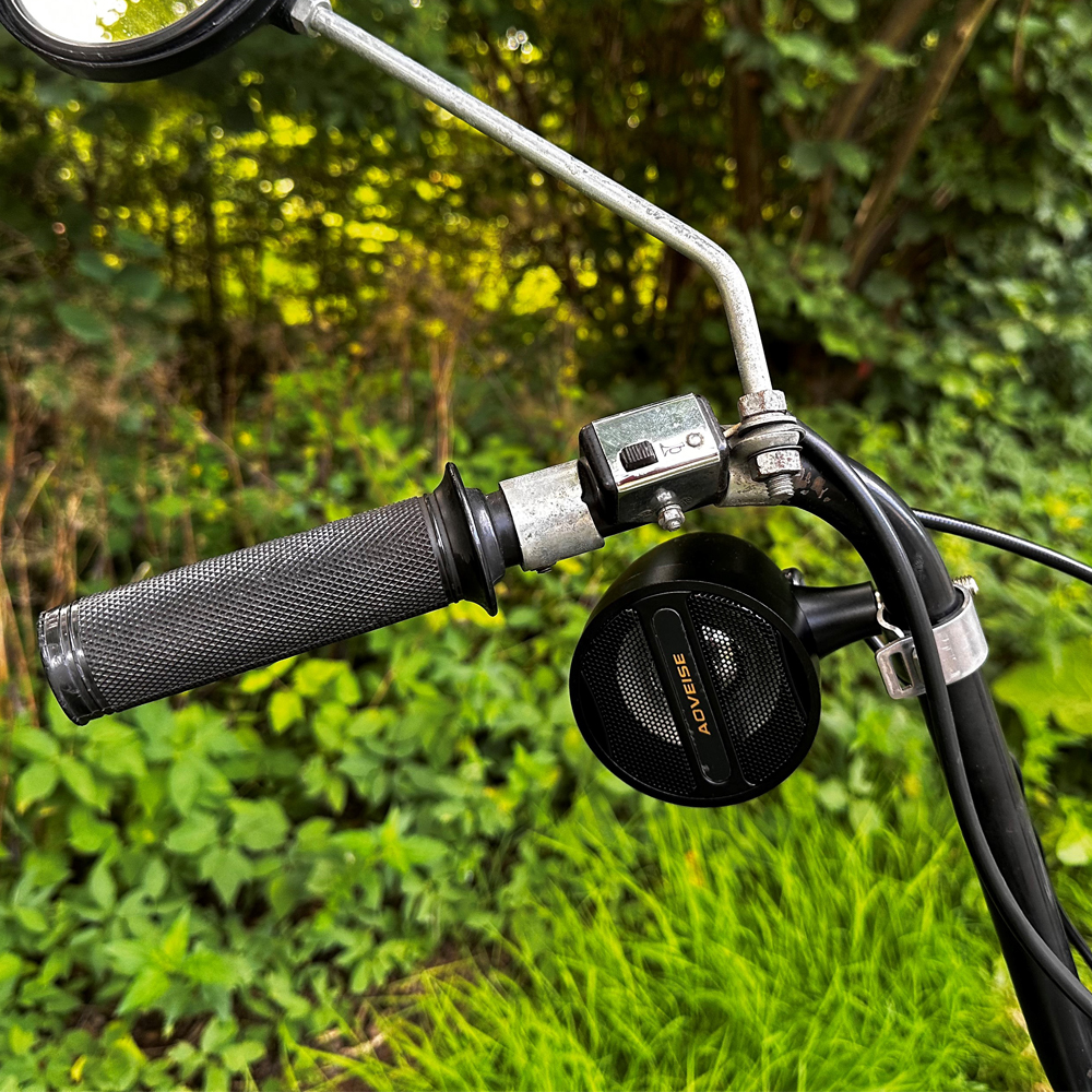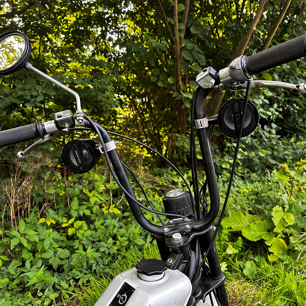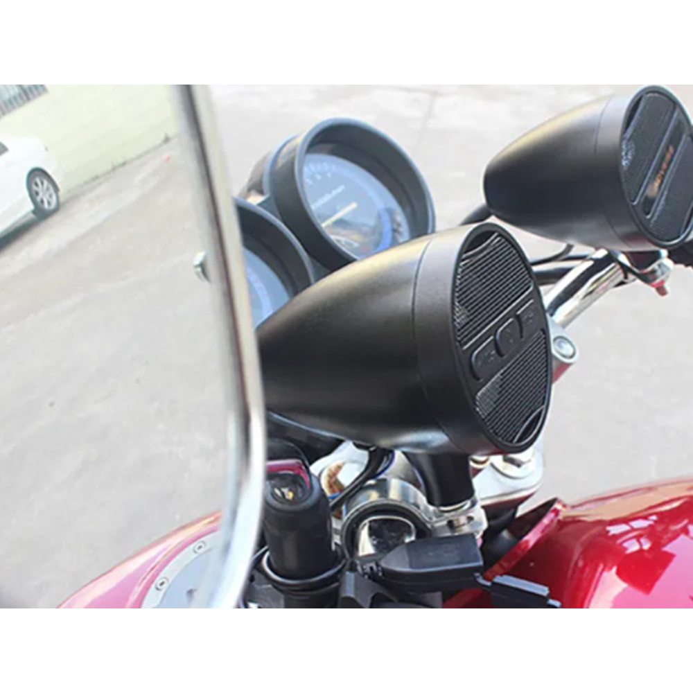 Zvukový systém s reproduktory pro vychutnání si poslechu hudby během jízdy na motocyklu, skútru či čtyřkolce, s možností přehrávání z USB, Bluetooth nebo FM tuner.