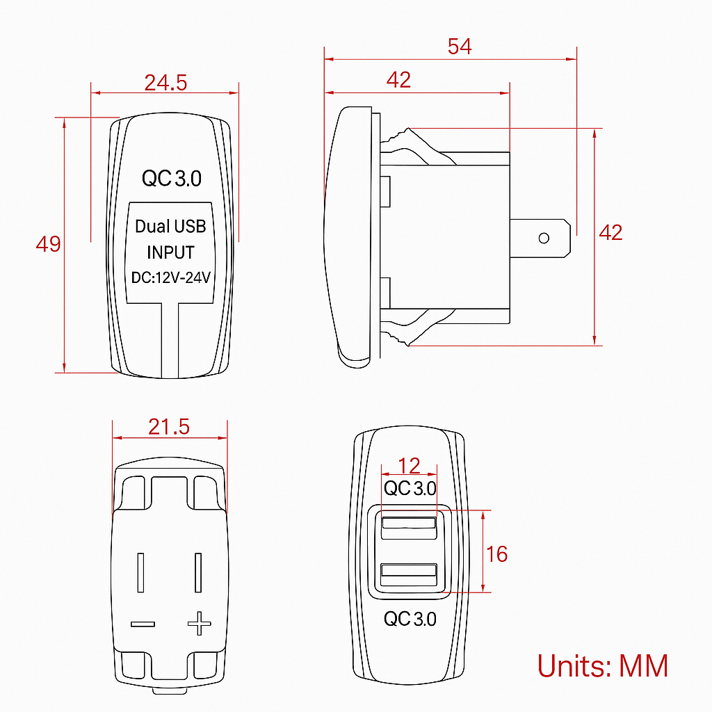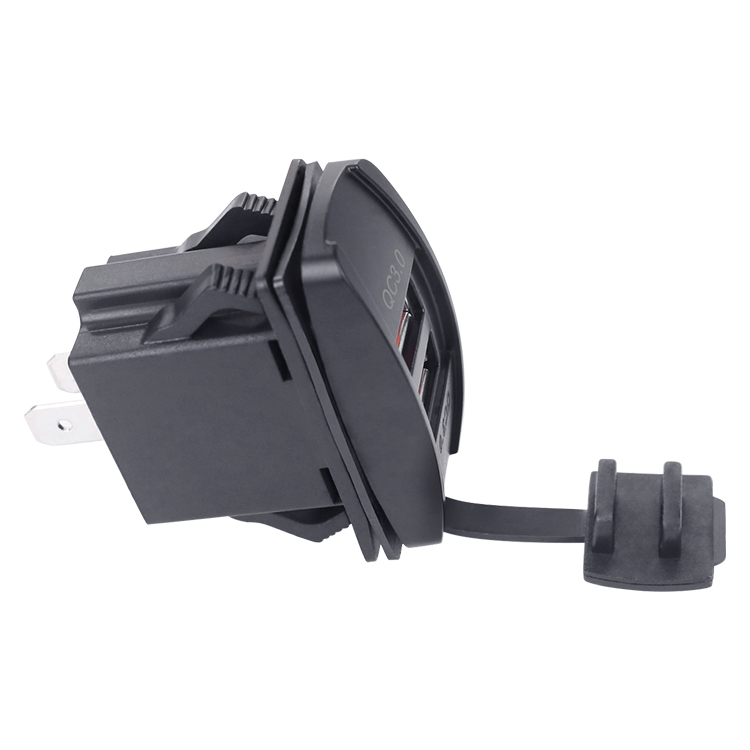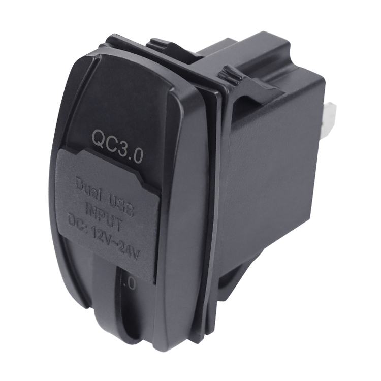2x USB zásuvka hranatá v provedení ROCKER, s krytkou proti prachu a vlhkosti, červené podsvícení.
