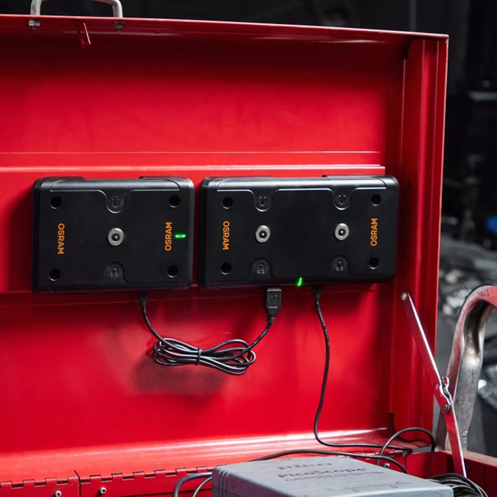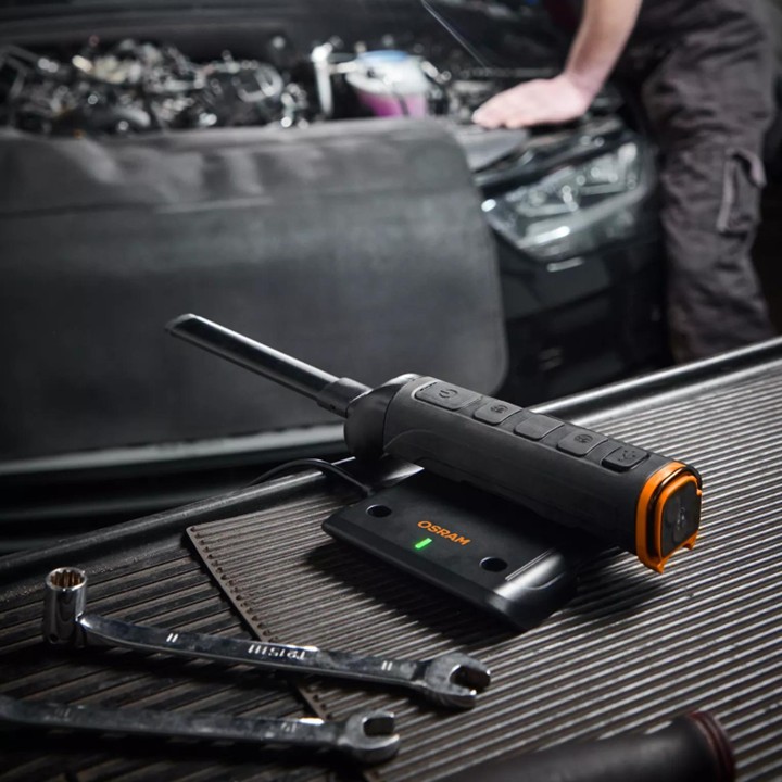 Bezdrátové inspekční svítiln OSRAM, které není nutné hledat a připojovat ke správnému nabíjecímu kabelu, se dobíjejí bez potíží pouhým položením na magnetickou nabíjecí podložku.